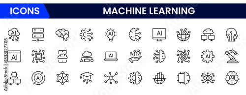 Sleek vector web line icons depicting machine learning, algorithms, neural networks, data analysis, and AI-driven innovation for intelligent systems.