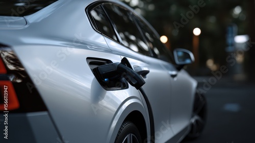 Sleek white electric sedan charging at a public station in a quiet urban area during early evening, highlighting modern eco-friendly transportation and the shift toward sustainable electric mobility