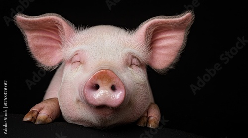 Sleeping piglet, close-up, black background, farm animal