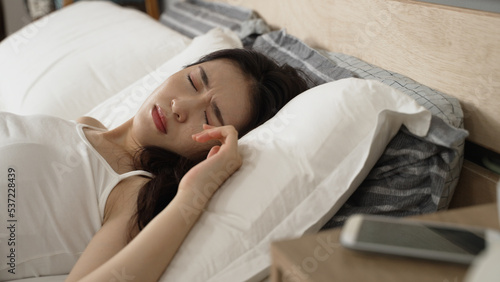 sleepy asian korean female woken by alarm clock triggered on her phone keeps sleeping after turning it off and checking time in the bedroom at home.