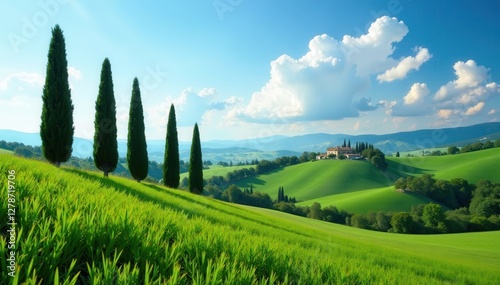 Slender cypresses rise against Tuscan sky, vibrant green foliage , shadow, sky, sun