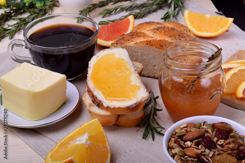Slice of bread with butter and jam. Breakfast food