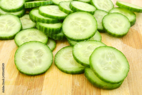 Slice of green cucumber vegetable isolated on wooden board