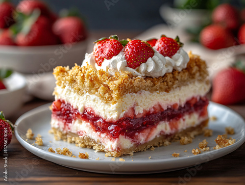 slice of layered strawberry dessert with a creamy filling, topped with whipped cream and fresh strawberries, served on a plate with additional strawberries and a bowl in the background.