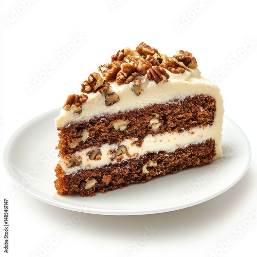 Slice of pecan cake on white plate