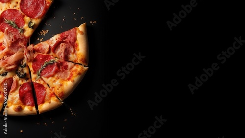 Slice of Pizza in dark background with space for text, mockup illustration with Generative AI