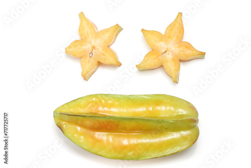 Sliced and whole fresh organic star fruit delicious top view face photo concept isolated on white background clipping path