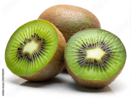 Sliced and whole kiwi fruits on white