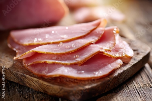Sliced cured ham on a wood cutting board with soft shadows and natural color