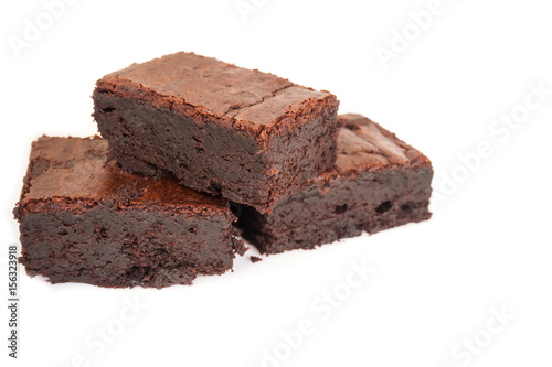 Sliced homemade brownies tower on white background. Sweet and moist of chocolate dessert.