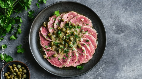 Sliced Meat with Herbs and Capers on a Plate