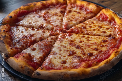 Sliced pizza on plate. Rustic wood background