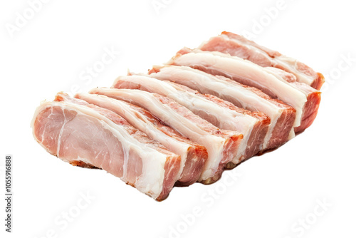 sliced pork belly with layers of fat and lean meat, on a white backdrop