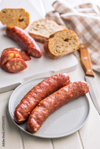 Sliced smoked sausage on plate