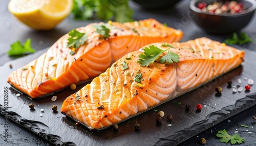 Slices of cooked salmon on a slate board, garnished with lemon, parsley, and peppercorns, highlighting a healthy meal option