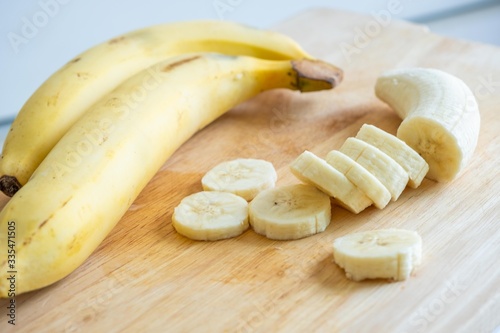 Slices or chopped yellow banana on cutting board.