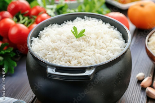 Slow cook rice for a hearty meal. Cooked rice in a black pot with herbs