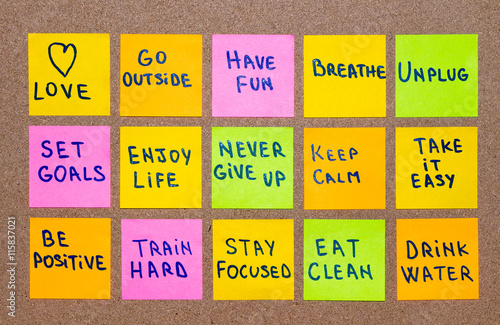 slow down, relax, take it easy, keep calm, love, meditate, go outside, enjoy life, be positive, have fun, unplug, breathe and other motivational lifestyle reminders on colorful sticky notes