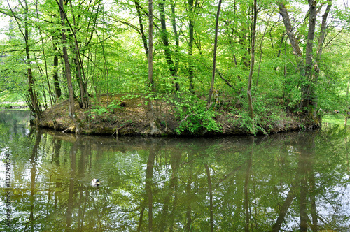 Small beautiful island with trees in the middle of the river in the spring.