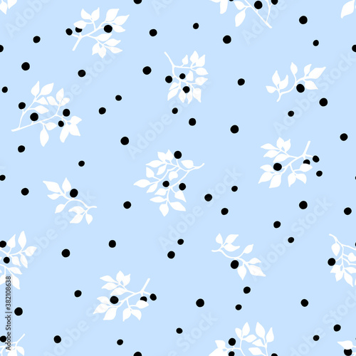 Small black and white wild blueberry on pastel blue. Vector seamless pattern.