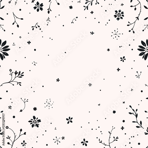 small black dots and flowers scattered across a light pink background.