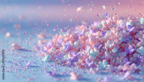 Small, brightly colored, flower-shaped confections create a textured mound on a light blue surface.
