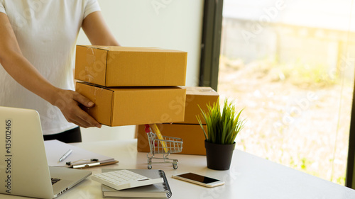 Small business owners working with laptops and cardboard boxes at work Small business entrepreneurs SME working with boxes at home selling online e-commerce