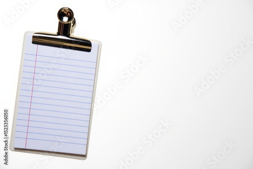 Small clipboard with a blank lined notepad on a white surface, isolated minimalistic office or study workspace, clean and organized
