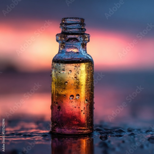 Small glass bottle with colorful liquid, sunset backdrop