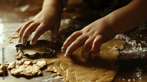 small hands baking cookies, pressing a cookie cutter into dough, kitchen counter scene