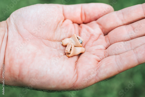 small intra channel hearing aid device in a man's hand