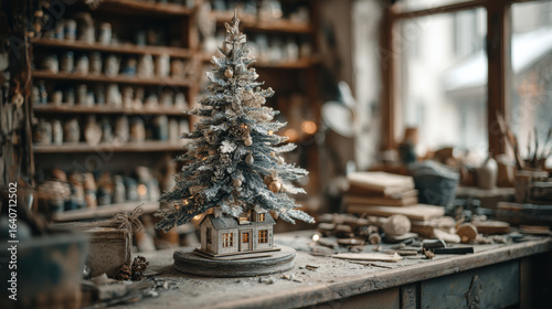 Small, intricately detailed Christmas tree with lights stands on wooden table in cozy workshop, surrounded by crafting tools