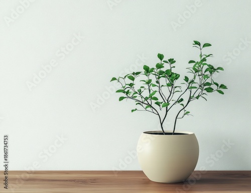small leafy indoor plant with thin branches in a round cream ceramic pot on a wooden table against a plain white wall, minimalist and serene
