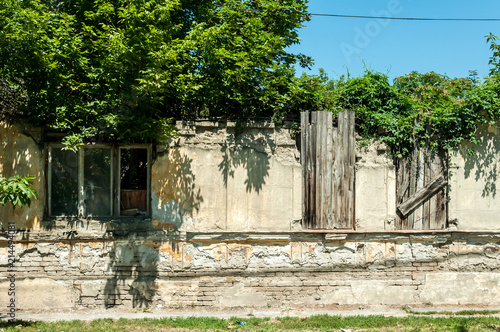 Small old and abandoned house demolished in the earthquake destruction with collapsed roof and broken windows covered with tree branches