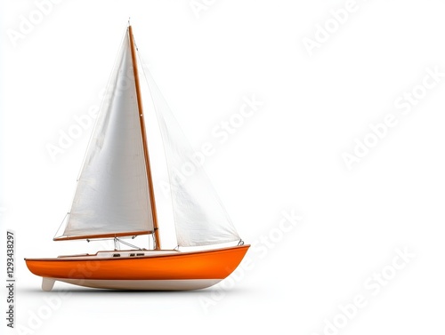 Small orange and white sailboat on white background. Classic design, isolated view. Perfect for nautical themes