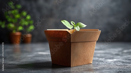 Small plant in brown box next to biodegradable kraft paper takeout container on table