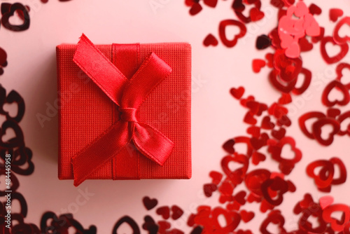 Small red giftbox and heart confetti on pale pink background. Flat lay.
