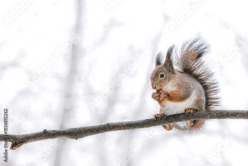 small red squirrel sitting on tree branch in winter park and eats a hazelnut.