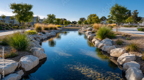Small retention pond bordered by rocks, clear water, green trees, and blue sky, peaceful scene