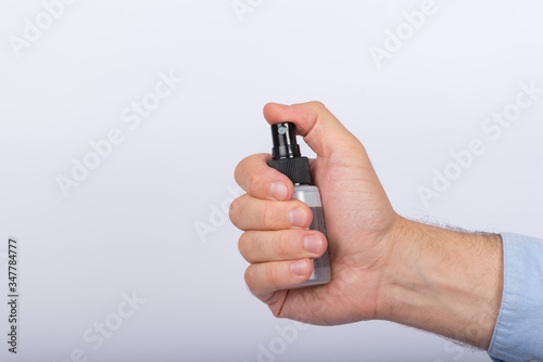 Small spray bottle in male hand. White background. Antimicrobial protective spray.
