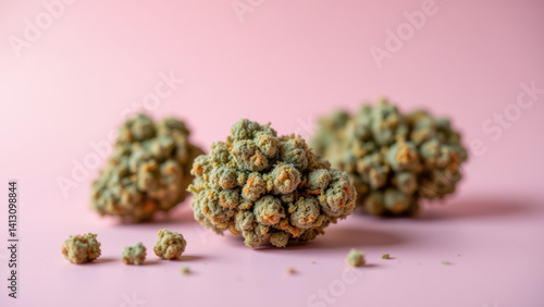 Small THC crystals on a light pink surface with focus on the crystals' texture and shine.