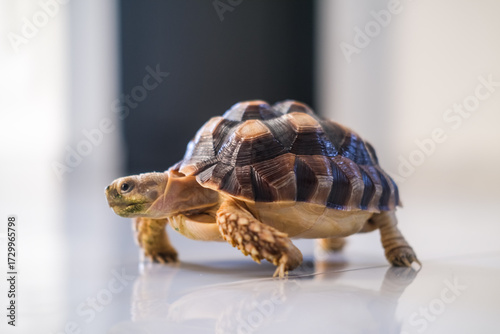 Small tortoise walking slowly on a smooth reflective surface indoors, its patterned shell catching the light while its curious face looks ahead with calm and steady movement.