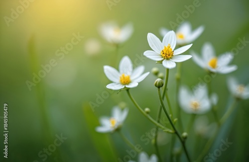 Small white flowers with yellow centers grow in soft green grass under warm sunlight. Delicate petals open wide, revealing plant buds. Natural park scene, nature growth.