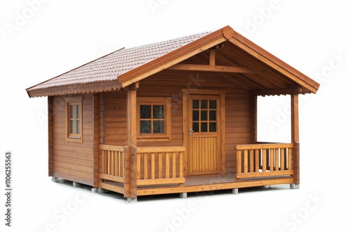Small wooden house; porch, windows, door.