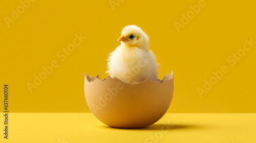 small yellow chicken in a shell on a yellow background. postcard with copy space, easter concept.