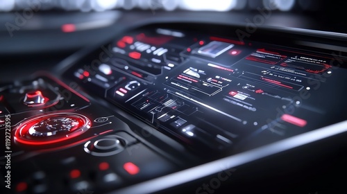 Smart car dashboard, futuristic holographic UI, glowing displays, 3D illustration