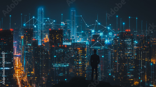 Smart digital city with connection cyber security network reciprocity over the cityscape . future smart wireless digital city and social media networking systems that connects people within the city