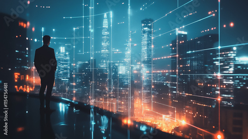 Smart digital Innovation city with connection network reciprocity over the cityscape. of future smart wireless city and social media networking systems that connects business people with in city