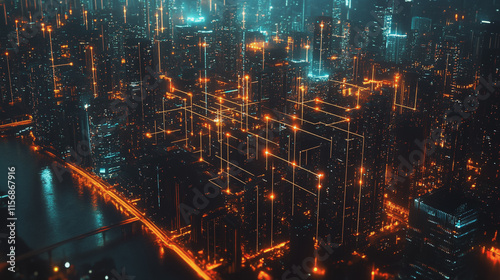 Smart digital Innovation city with connection network reciprocity over the cityscape. of future smart wireless city and social media networking systems that connects business people with in city