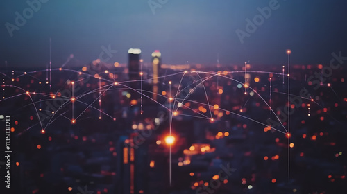 Smart digital Innovation city with connection network reciprocity over the cityscape. of future smart wireless digital city and social media networking systems that connects people with in city